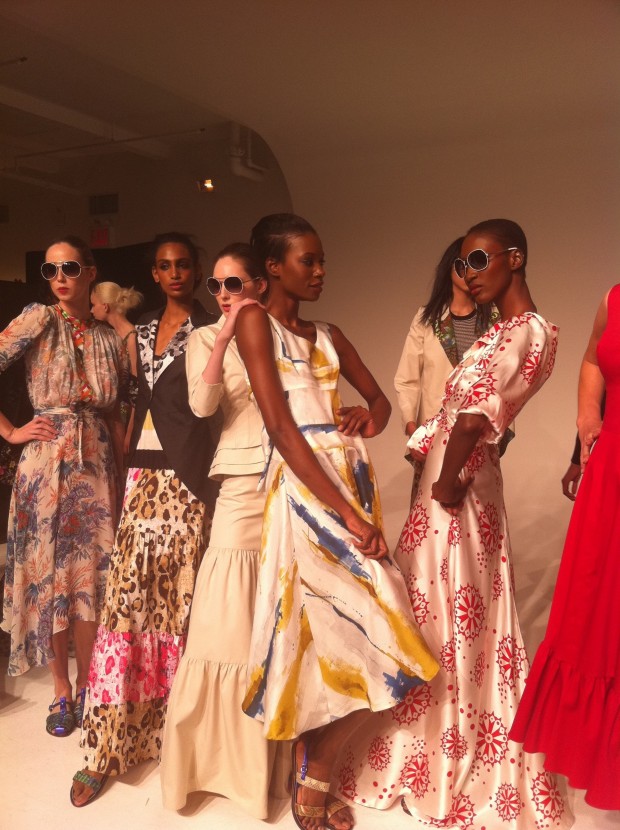 Duro Olowu certainly knows how to paint a pretty picture. His Spring 2012 Collection which showcased at Milk Studios in Manhattan this past Saturday, featured an array of colorful patterns and ultra feminine silhouettes that would make any girly-girl’s mouth water with unquenchable thirst. As the models sashayed and paused to strike a pose, it was hard to ignore the gorgeous prints and intricate details of each garment. Olowu spared no expense this time around and incorporated all the elements that make for a well-balanced collection. Animal prints were blended in with different patterns sporting equally lively hues. Floral prints were also evident in romantic silk and chiffon fabrics. Almost all the dresses were long and flowed with ease giving that unbeatable “Cinderella” effect.