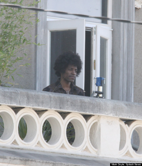 The 1st pictures of ANDRE 3000 on the 1st day of shooting the Jimi Hendrix movie – “All is by my side”, he came out on the terrace of the Victorian 1840s house, an old man was with him & touching his hair, I think he might have been the hair stylist !!